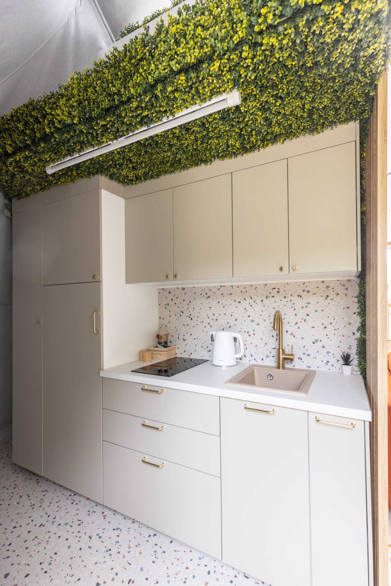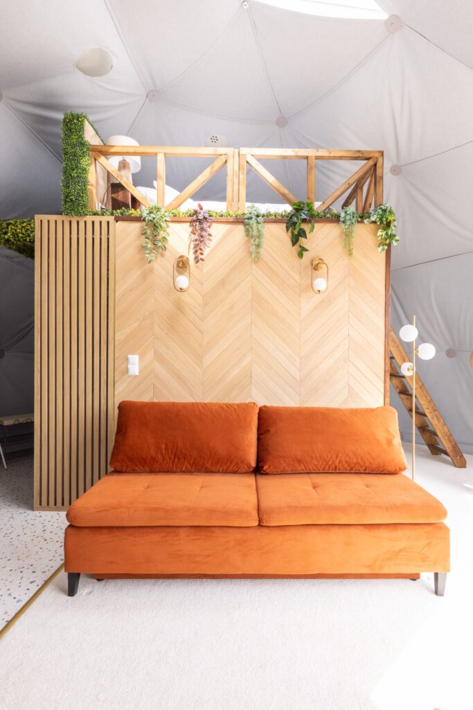 Jednym z głównych atutów Glampu nr 1 jest przestronna antresola, która dodaje wnętrzu lekkości i zapewnia dodatkowe miejsce do wypoczynku. Domek wyposażony jest w dwa komfortowe miejsca do spania – łóżko o szerokości 140 cm oraz wygodną, rozkładaną sofę, co czyni go idealnym wyborem dla rodzin, grup przyjaciół lub par ceniących sobie przestrzeń.