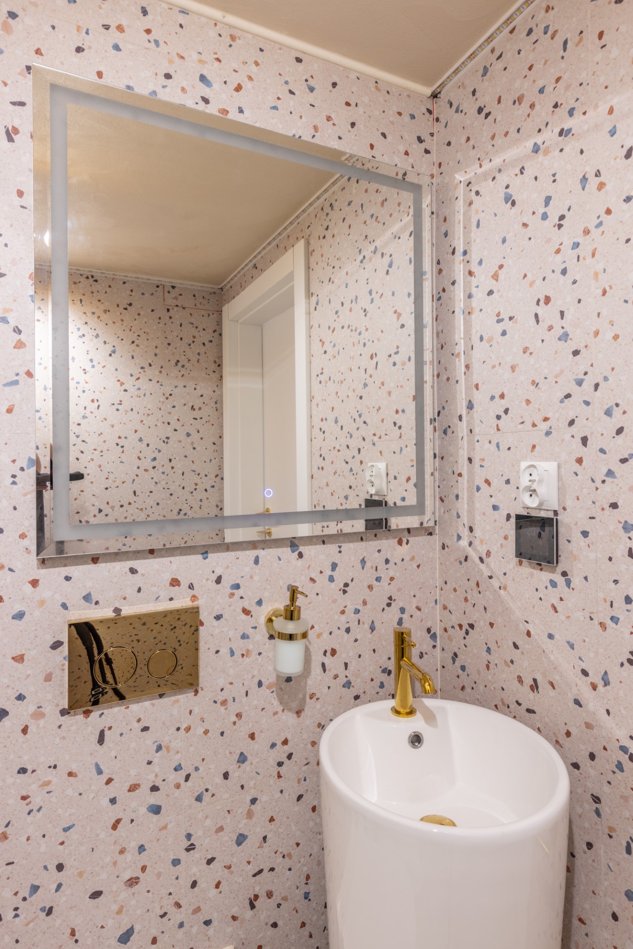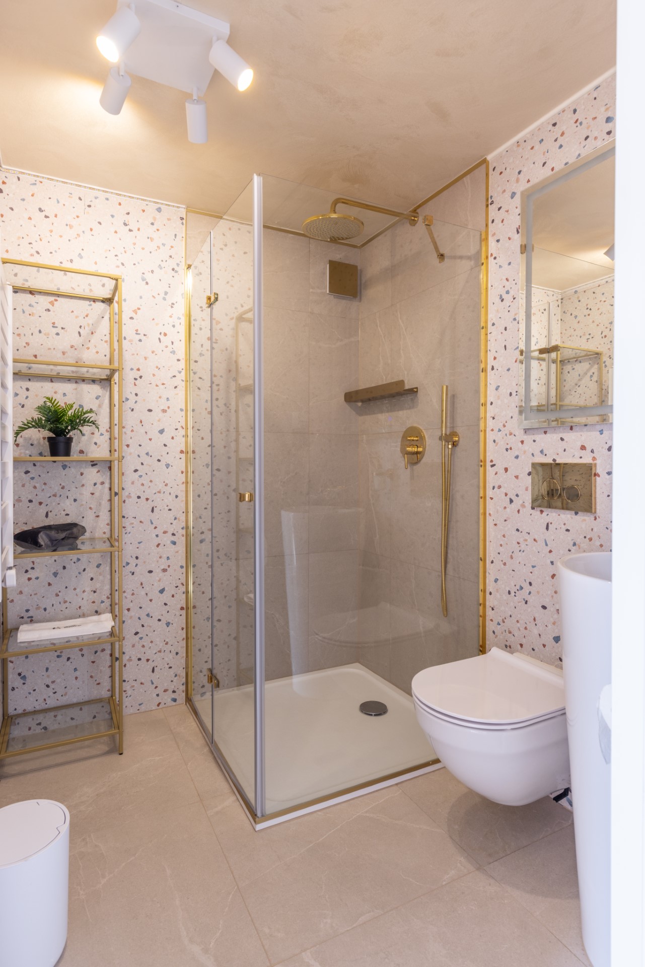 Łazienka w złotych tonach to prawdziwa perełka tego domku, oferująca elegancję i odrobinę luksusu, który podkreśla wyjątkowy charakter tego miejsca. Duże okna zapewniają naturalne światło i pozwalają na podziwianie pięknych widoków na otaczającą naturę, niezależnie od tego, czy odpoczywasz na antresoli, czy relaksujesz się na sofie.