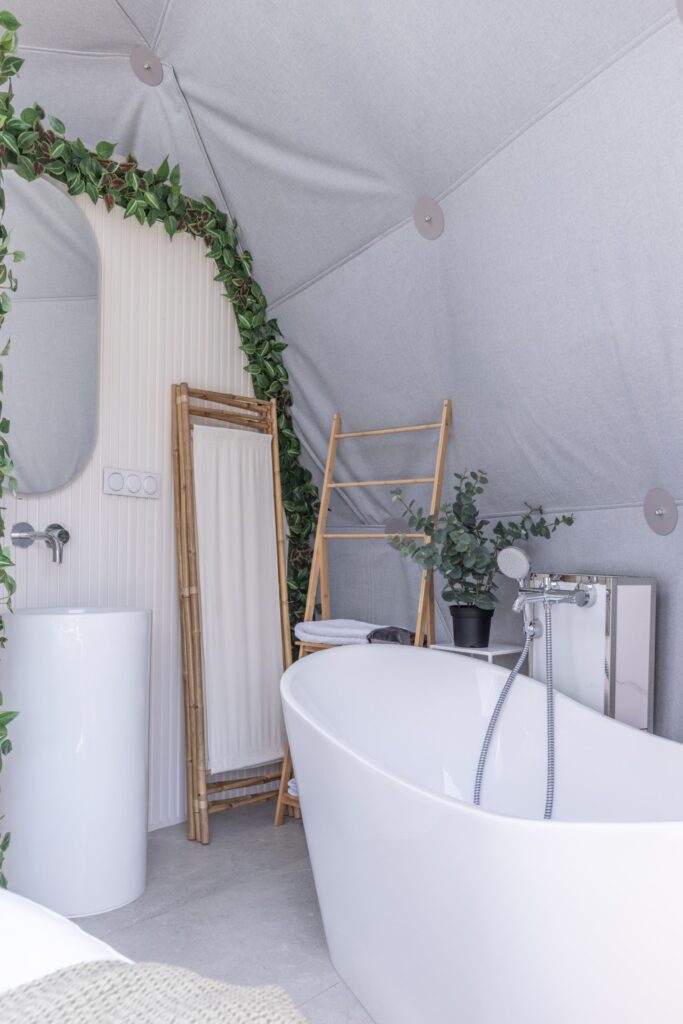 Wnętrze Glampu nr 3 emanuje ciepłem i przytulnością, tworząc idealne warunki do wypoczynku dla par, które szukają intymności i romantycznej atmosfery. Serce domku stanowi elegancka, wolnostojąca wanna, która zachęca do wspólnego relaksu po dniu pełnym przygód. To idealne miejsce, by zanurzyć się w kąpieli, ciesząc się chwilą wytchnienia w towarzystwie bliskiej osoby.