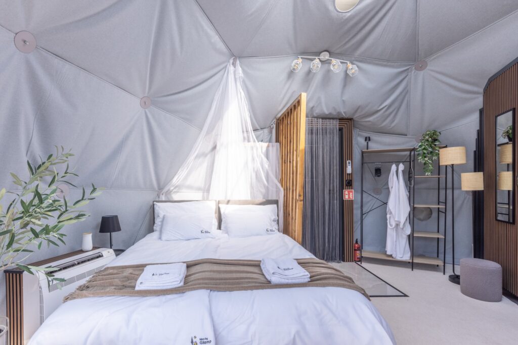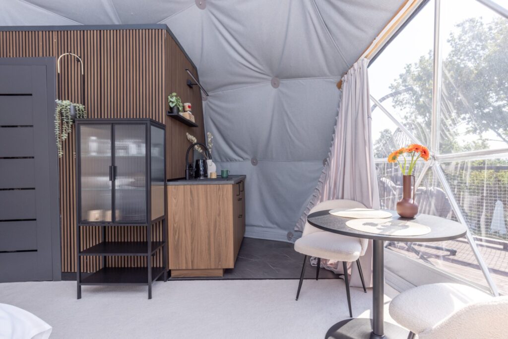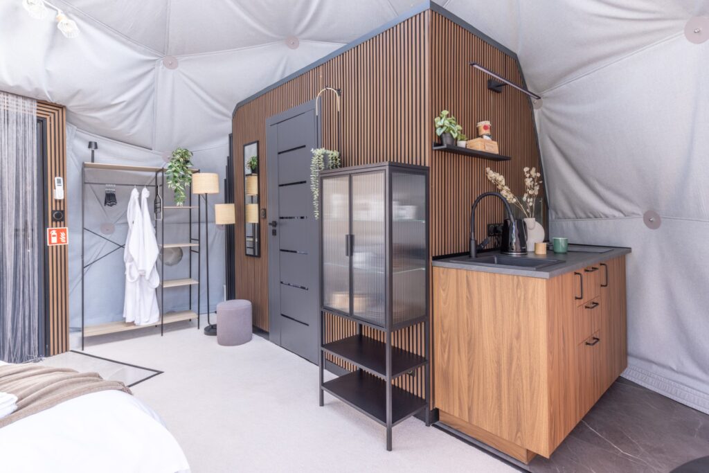 Mimo kompaktowych rozmiarów, Glamp nr 4 oferuje przestrzeń, która zaskakuje swoją funkcjonalnością i komfortem. Duże okna wpuszczają mnóstwo naturalnego światła, potęgując poczucie przestronności, a starannie dobrane detale wystroju wprowadzają ciepło i przytulność.