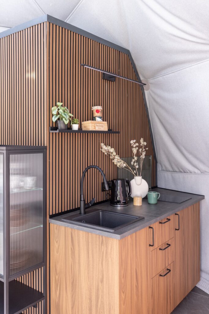 Jednym z wyróżniających się elementów Glampu nr 4 jest piękna, drewniana łazienka, która łączy w sobie naturalne materiały z nowoczesnymi udogodnieniami, tworząc idealne miejsce do odprężenia się po długim dniu spędzonym na odkrywaniu okolicy. Dodatkowo, domek wyposażony jest w aneks kuchenny, umożliwiający przygotowanie prostych posiłków, co czyni go idealnym na dłuższe pobyty.