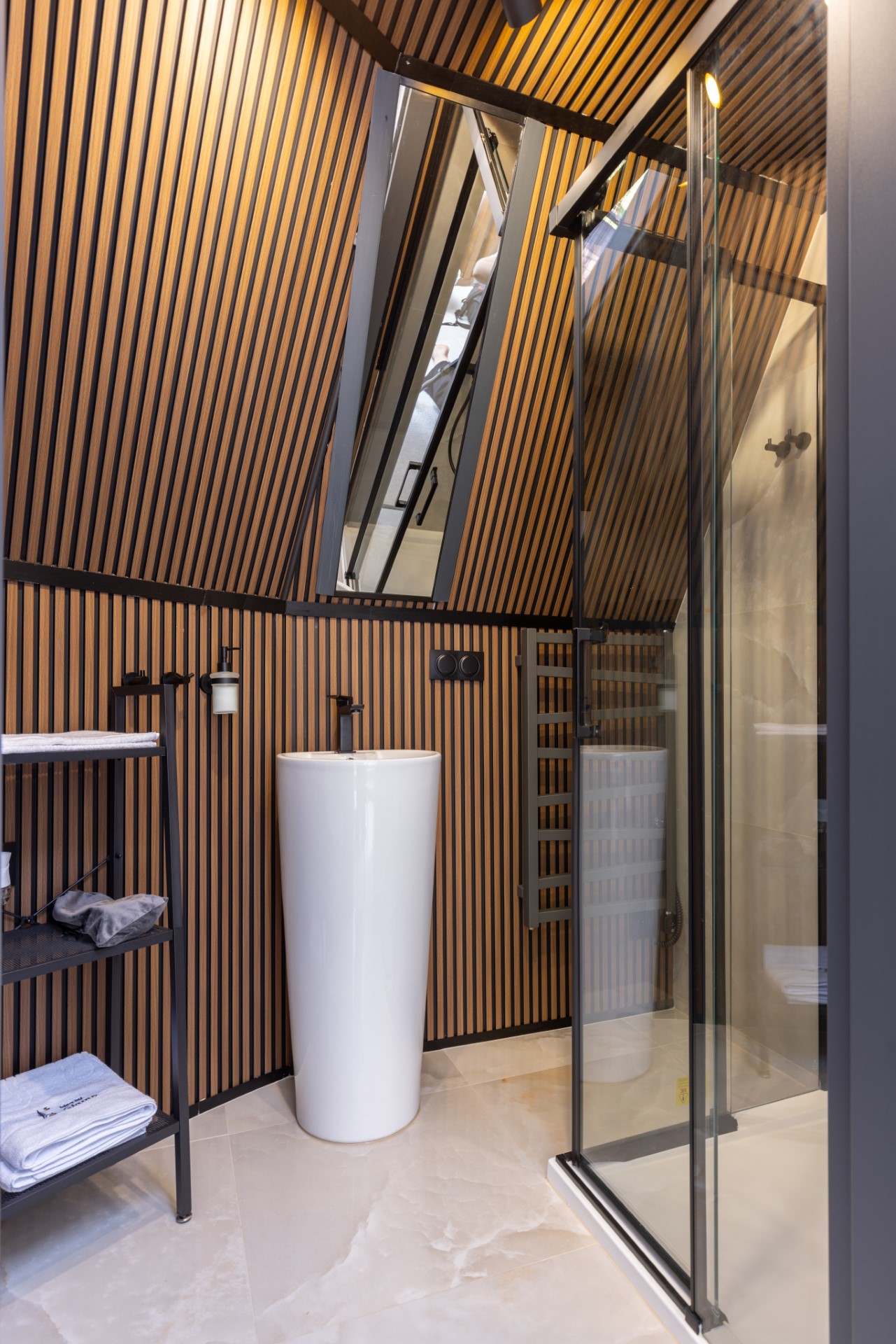 Prywatne łazienki dostępne są bezpośrednio w każdym domku.